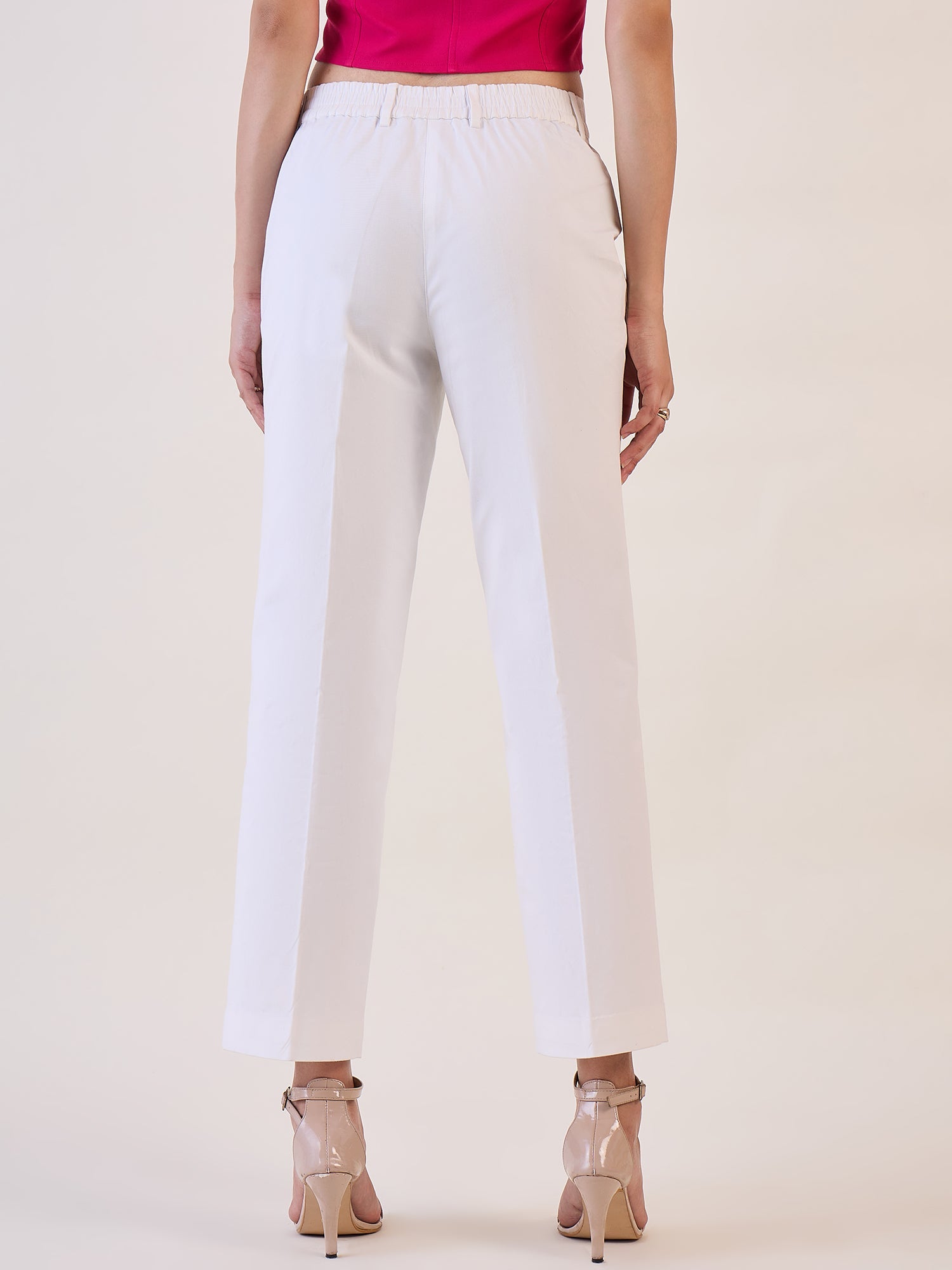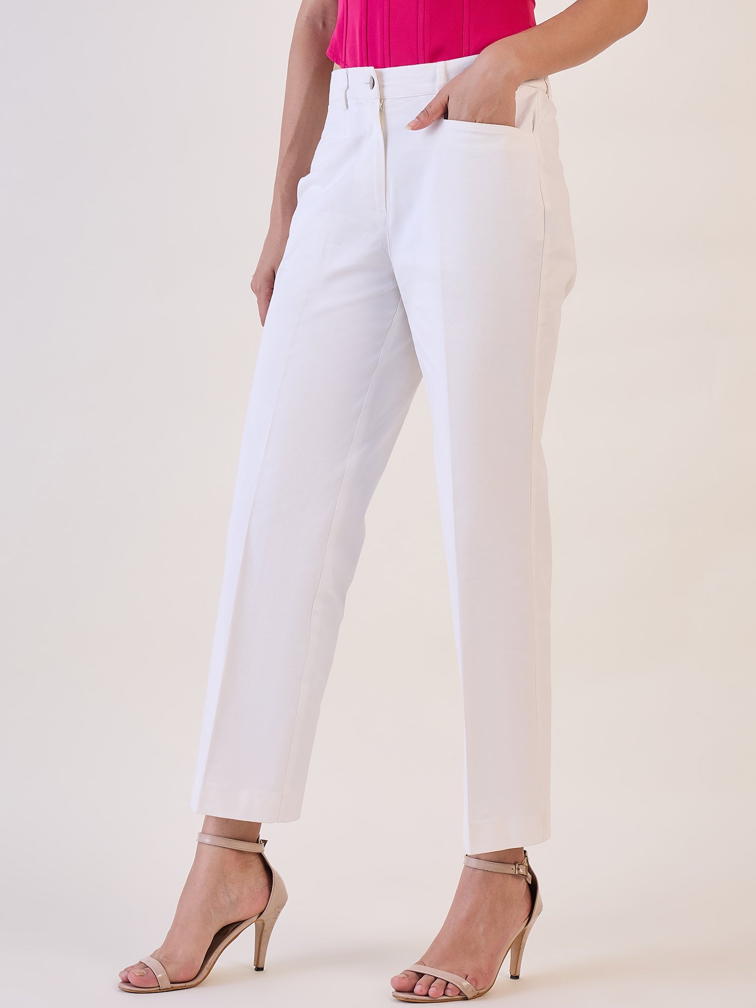 Mid waist white trousers in a straight fit with a tapered leg by Powersutra Womenswear. Ankle length office pants with mid rise fit and straight leg design. Front fastening with zipper and button. Perfect for work or casual wear, the solid white pattern adds a timeless elegance to your wardrobe. Made from premium fabric, they're easy to care for with a machine wash option. Tailored ankle grazer trouser with button fastening. These white regular fit pants are a must-have staple for any modern woman. Shop now for chic and comfortable fashion at Fyaril!